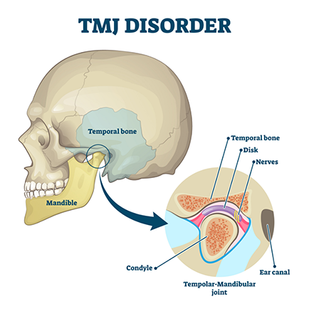 Temporomandibular joint (TMJ) disorder occurs when the joints located on the side of your head (those that connect your jaw to your skull) become inflamed or injured. This can occur as a result of stress, teeth grinding, bite misalignment, or facial trauma. Over time, if left untreated, it can negatively affect daily life and your ability to complete essential tasks, like eating and speaking.